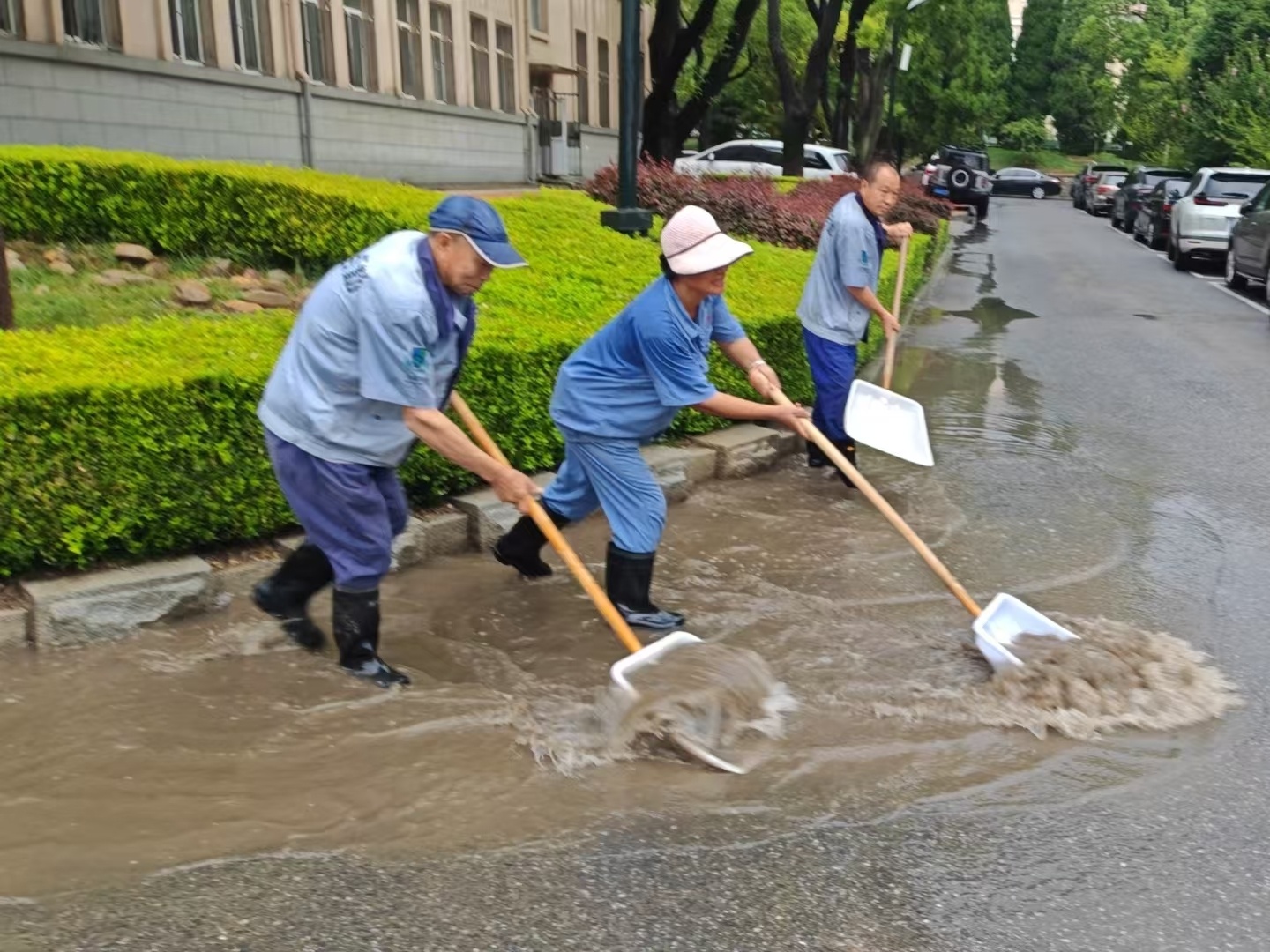 针对易积水区域,后勤集团物业中心提前采取了精准措施:黄河路校区南院体育学院重装雨水管与排水管;心理楼低洼处增设挡水台;北院操场最低点新装排水管,墙面开排水口加速排涝。这些举措显著提升了排水效率,快速排除积水隐患。