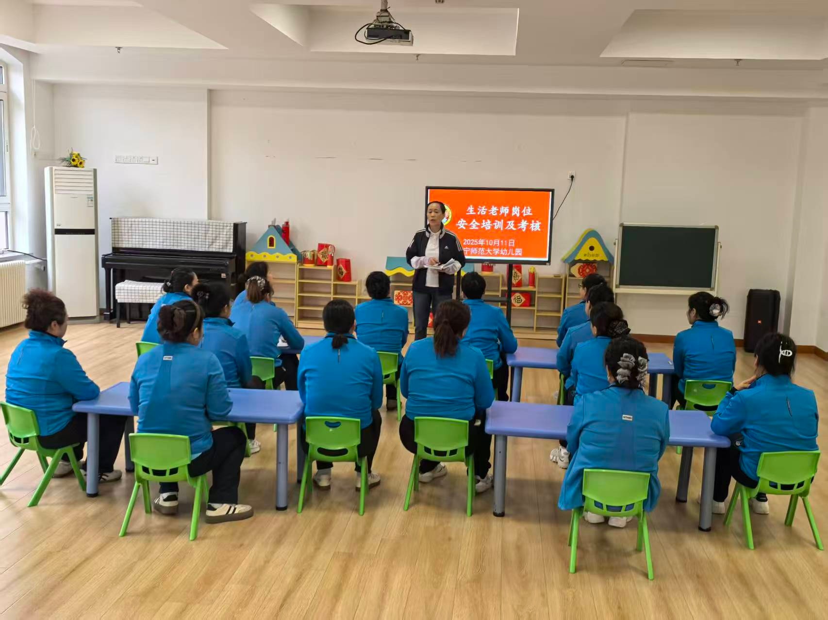 为进一步强化幼儿园生活教师的安全意识,提升安全防护技能,切实保障幼儿在园生活的安全与健康,2025年10月11日,辽宁师范大学幼儿园组织全体生活老师开展了岗位安全培训及考核活动。