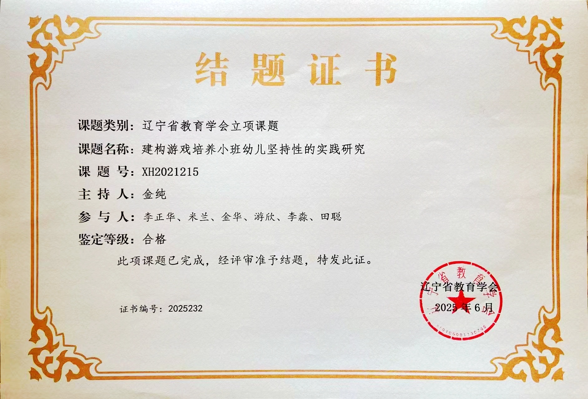 近日,由辽宁师范大学幼儿园金纯老师主持、李正华园长及相关教师共同参与的辽宁省教育学会立项课题《建构游戏培养小班幼儿坚持性的实践研究》(课题编号:XH2021215),经辽宁省教育学会评审,顺利通过结题验收,获“合格”等级,结题证书已正式颁发。