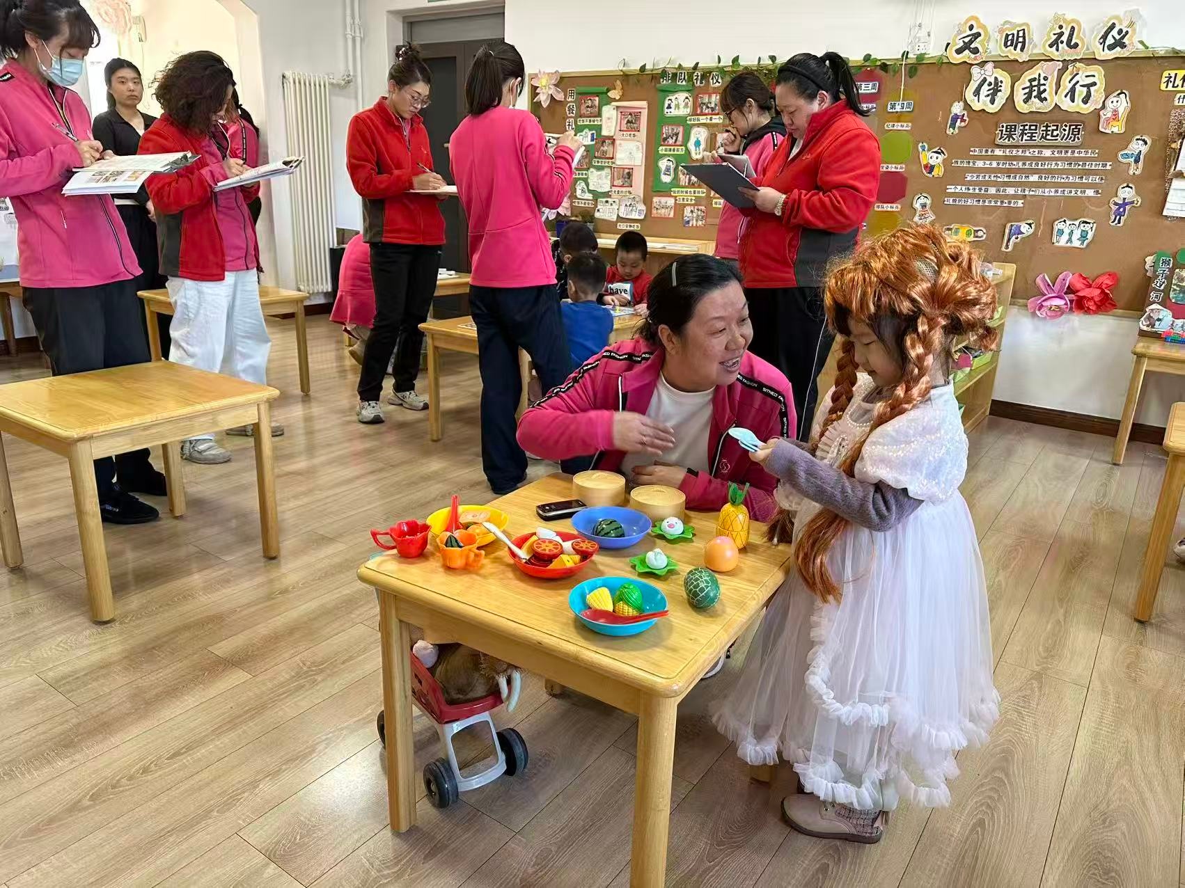 活动现场,幼儿们化身“游戏主角”,在角色扮演、益智操作等自主游戏区自由探索:身着特色服饰的幼儿沉浸式开展角色扮演游戏,通过模拟生活场景锻炼语言表达与社交能力;教师们则以“观察者”“记录者”的身份,手持记录册细致捕捉幼儿的游戏行为、互动方式及问题解决过程,重点关注幼儿在自主游戏中的兴趣点、专注力与创造性表现。