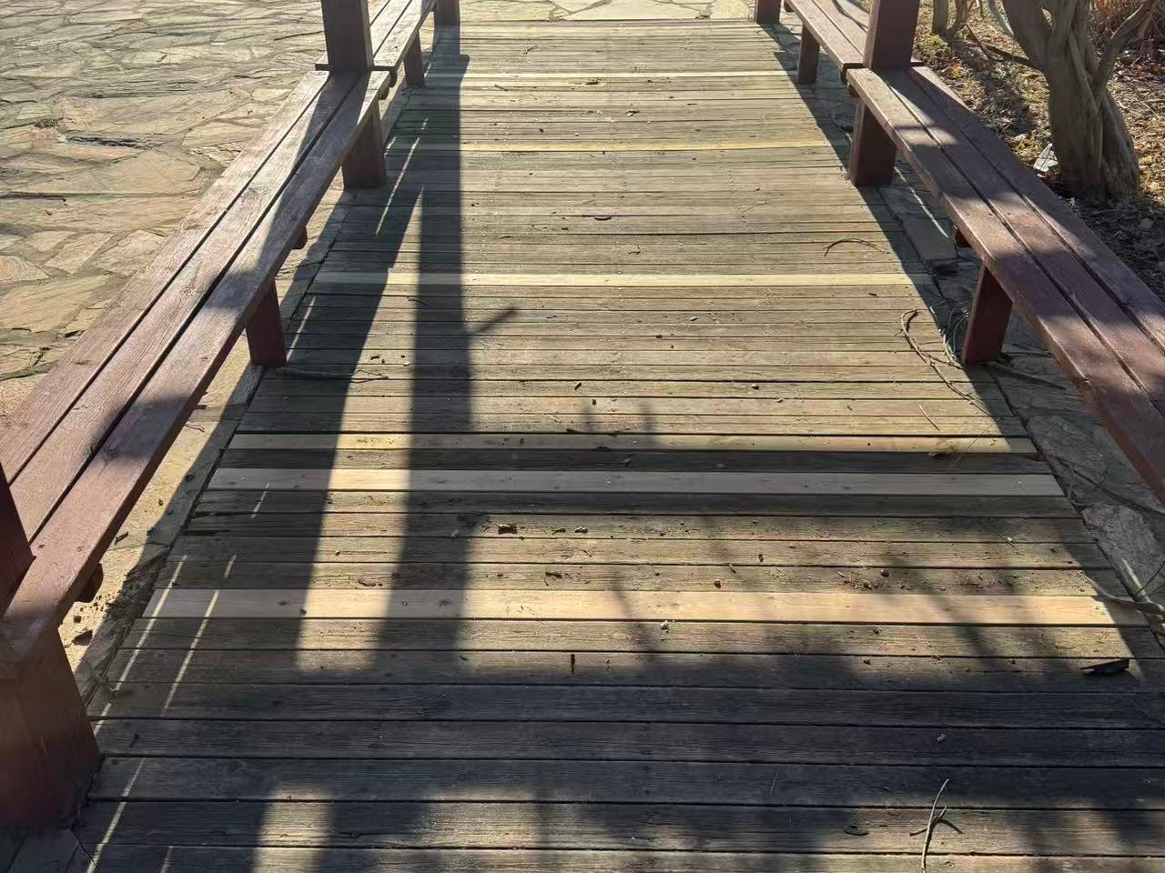 半坡亭由于长期风吹日晒和使用损耗,部分防腐木出现了不同程度的损坏,不仅影响了美观,更存在一定的安全隐患。发现问题后,维修师傅立即对损坏的防腐木进行了全面更换。如今,焕然一新的半坡亭再次成为校园里一道亮丽的风景线。