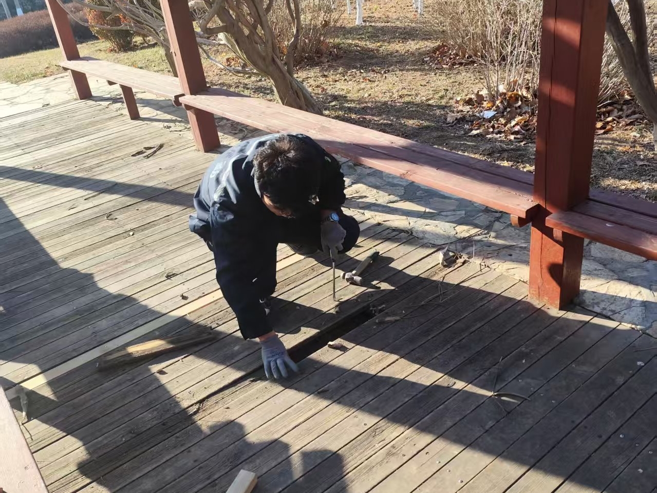 近日,物业管理服务中心维修部在日常巡检工作中发现了西山湖校区半坡亭存在部分防腐木损坏的情况,迅速采取行动,为师生们营造了一个更加安全、舒适的休憩环境。